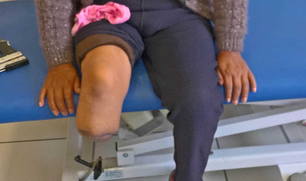 Dank einer Prothese konnte der Orthopädie-Techniker im Diospi Suyana Hospital, kann sie nun wieder ohne Rollstuhl gehen.